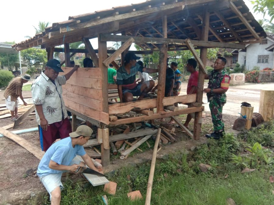 Babinsa Koramil 424-10/Pardasuka Sertu Martoyo bersama warga binaan gotong royong membangun pos Kamling di di Dusun. Kerebang Pekon Pardasuka kec Pardasuka kab. Pringsewu, Rabu (22/02/2023).