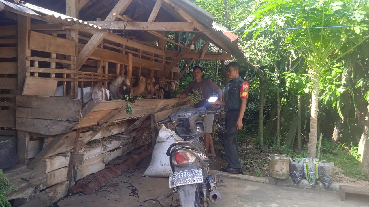 Babinsa Koramil 424-10/Pardasuka Serda M. Toha berikan pendampingan kepada peternak kambing milik bapak Samijan di Pekon Suka Mara Kec. Bulok, Kab. Tanggamus. Jum’at (12/01/2024).