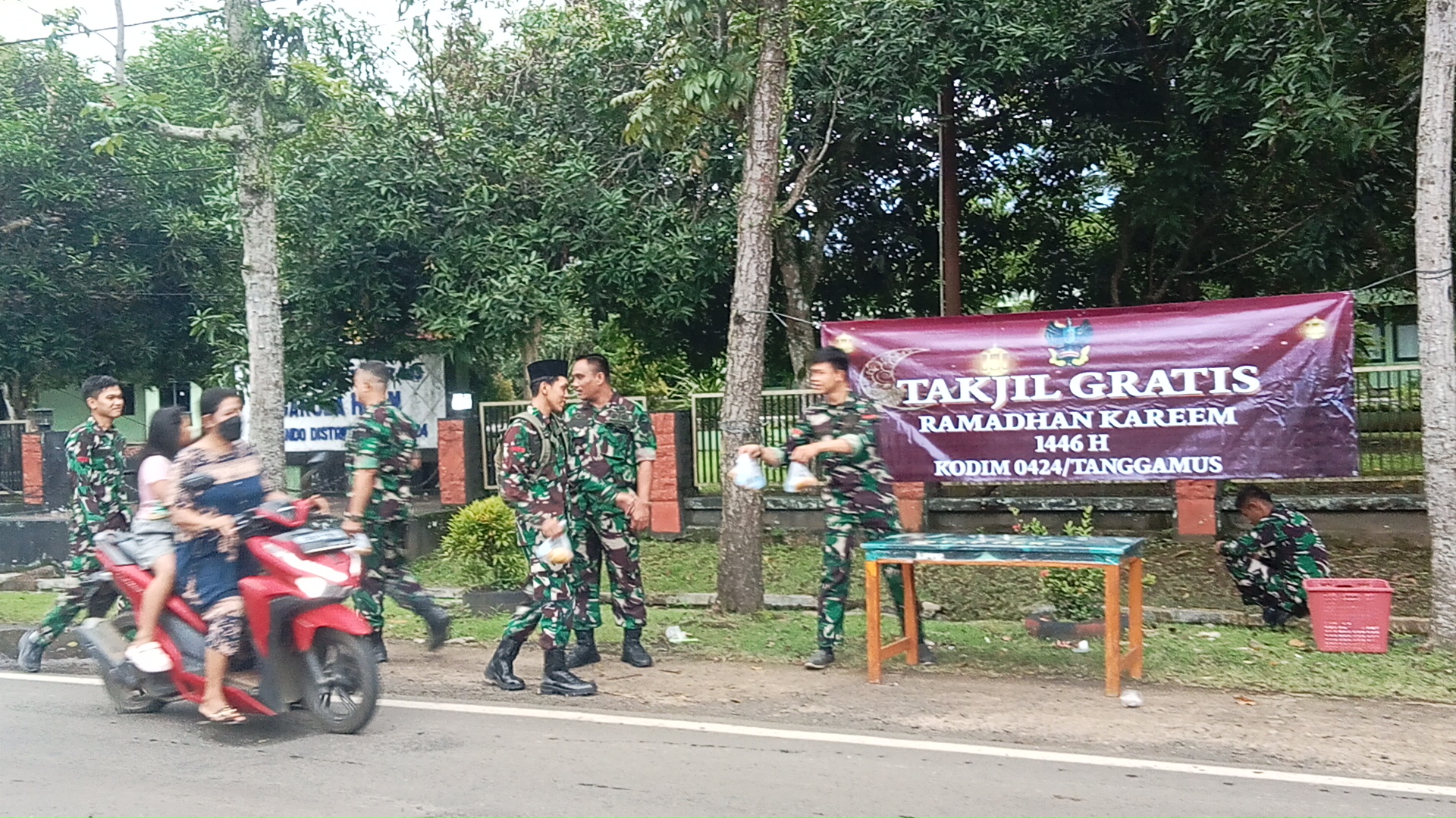 “Kegiatan Ini kerap dilakukan di bulan suci Ramadan, hari ini kita berbagi takjil gratis kepada masyarakat, khususnya para pengguna jalan yang melintas didepan Makodim 0424/Tanggamus,” ungkap Letkol Vicky.