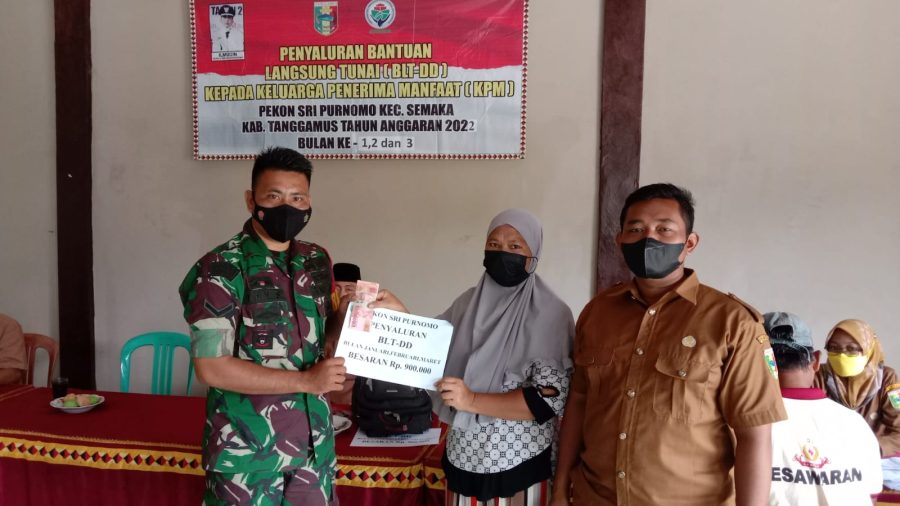 Babinsa Koramil 424-02/Wonosobo Serda Try Sutrisno melaksanakan pendampingan kegiatan pembagian BLT DD kepada warga masyarakat kurang mampu yang terdampak pandemi Covid -19 di pekon sripurnomo kec. Semaka. Rabu (16/03/22).