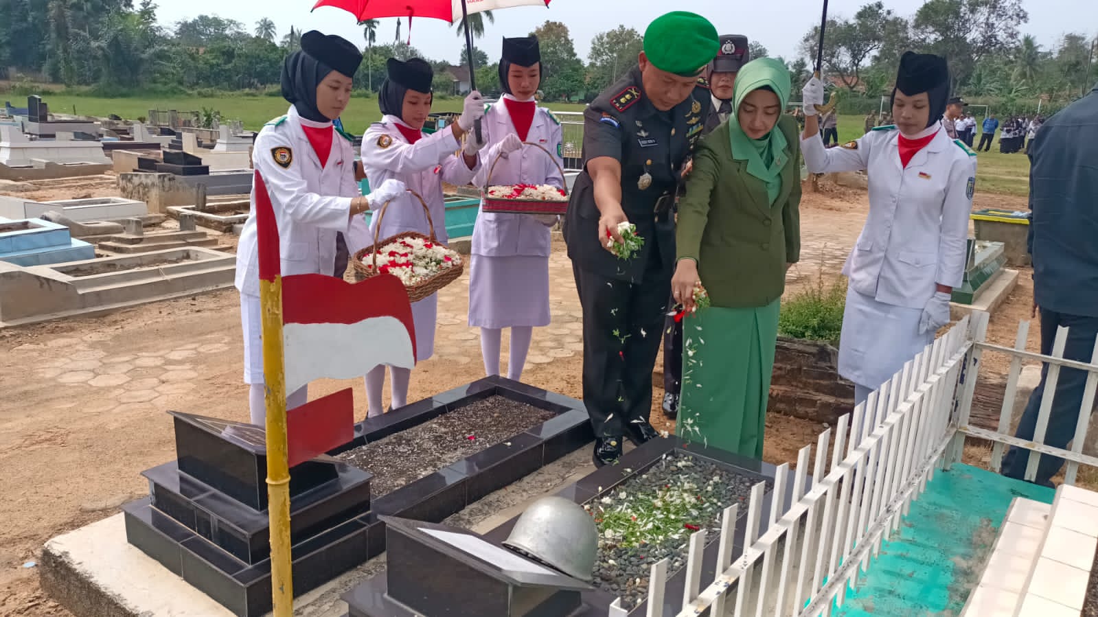 2024Dandim 0424/Tanggamus Letkol Inf Vicky Heru Harsanto.S.I.P.,M.Si beserta ketua Persit KCK Cab.XlVI Ny. Lia Vicky Heru Harsanto Beserta rombongan Forfimdan Pringsewu melaksanakan Ziarah di Taman Makam Pejuang Purna Yudha Bhakti TPU Bahagia Sukoharjo dalam rangka Hari Ulang Tahun Kab. Pringsewu Ke -15 Tahun 2024 di Pekon Keputran, Kecamatan Sukoharjo. Rabu (3/4/24).